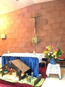 2017年12月23日。キリスト教の教会聖堂に、クリスマスの祝い花を